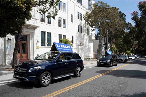 ![]() 图1:法轮功学员的车队从旧金山市立大学出发 |