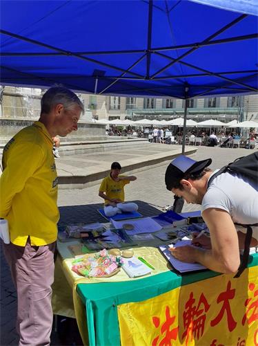 在展台旁,法轮功学员们静静地炼功场景和周围摆放的展板,吸引了很多过往行人驻足观看。展板上向民众揭示了中共强摘器官的实例,该地区的居民和一些游客看到了后很震惊,表示这是在犯种族灭绝罪。当天有近百人在二零一六年欧洲议会通过的WD48宣言请愿书上签名,该请愿书强调中共当局是全国贩卖人体器官的起源,并谴责在中国通过强行手段获得人体器官的做法。 请愿书将发送给各法国各地区的议会代表,希望当地善良的人们帮助制止这场残酷的迫害。
