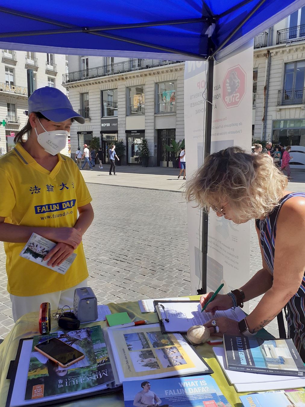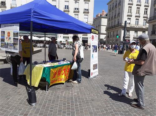 【明慧网二零二零年七月二十八日】二零二零年入夏以来,在南特市皇家广场上,每个星期六人们都会看到有一个展位,法轮功学员在此炼功和讲真相。七月二十五日,法轮功学员如期在这里揭露中共在中国迫害法轮功及其修炼者21年的罪恶,甚至强摘法轮功学员的器官贩卖。