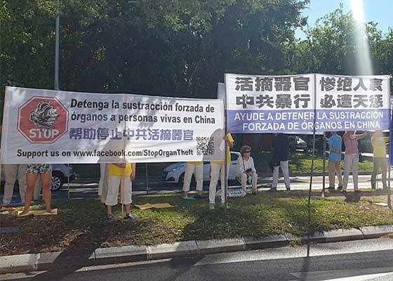 在西班牙疫情放缓全面解封之际,西班牙法轮功学员于2020年6月26日和7月3日在首都马德里的中使馆前集会,要求中共立即停止对中国大陆法轮功学员长达21年的迫害,停止迫害中国人,停止欺骗全世界。