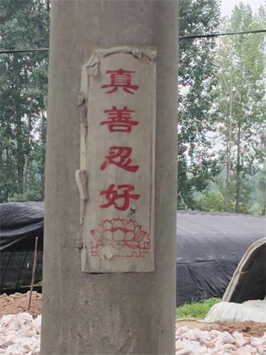 在路上,突然看到路边电线杆上的红色条幅,上面的字很熟悉。我下车走近,看到“真善忍好!”看着这熟悉的字,真是激动。