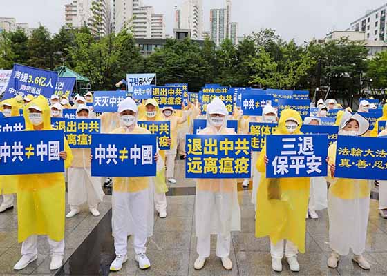 “法轮功来了!”“法轮功来了!”八月九日,韩国最大的中国城首尔大林洞一带,许多中国人在大雨中奔走相告,备受震撼。人们纷纷驻足,聚精会神地观看着由韩国法轮功学员组成的声势浩大的退党游行队伍。