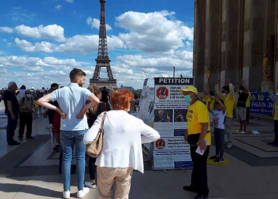 八月九日下午,巴黎人权广场沸沸扬扬,不同的团体的呼声、高音喇叭此起彼伏。虽然巴黎气温达到39°C,然而法轮功学员的活动场地却让人感受到一片清爽。