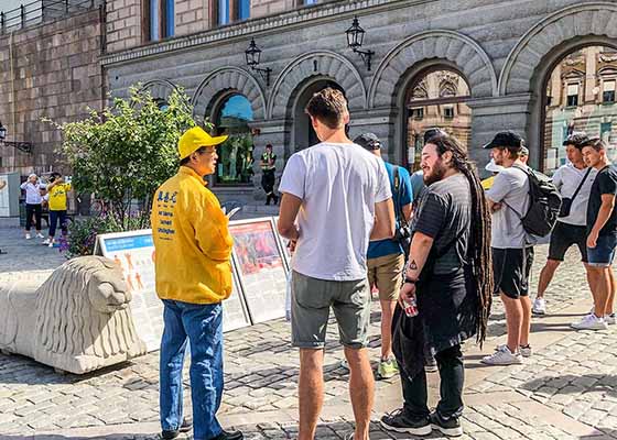 二零二零年八月十一日周二中午,瑞典法轮功学员在斯德哥尔摩市中心国会大厦旁的钱币广场举办讲真相活动。