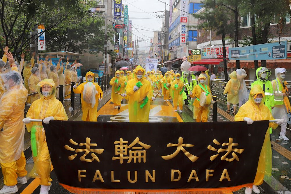 【明慧网二零二零年八月十二日】“法轮功来了!”“法轮功来了!”二零二零年八月九日上午,韩国最大的中国城首尔大林洞一带,许多中国人在大雨中奔走相告,备受震撼。人们纷纷驻足,聚精会神地观看着由韩国法轮功学员组成的声势浩大的退党游行队伍。