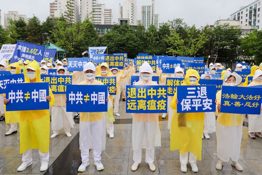 九日上午十点开始,约五百名来自首尔及周边地区的法轮功学员,在首尔九老儿童公园集会,随后冒大雨沿着韩国最大的中国城大林洞一带游行两个小时,向当地的中国人和韩国人传递了“退出中共,远离瘟疫”等讯息,为因挥之不去的瘟疫和雨灾而内心忧郁沉闷的人们带来光明和希望