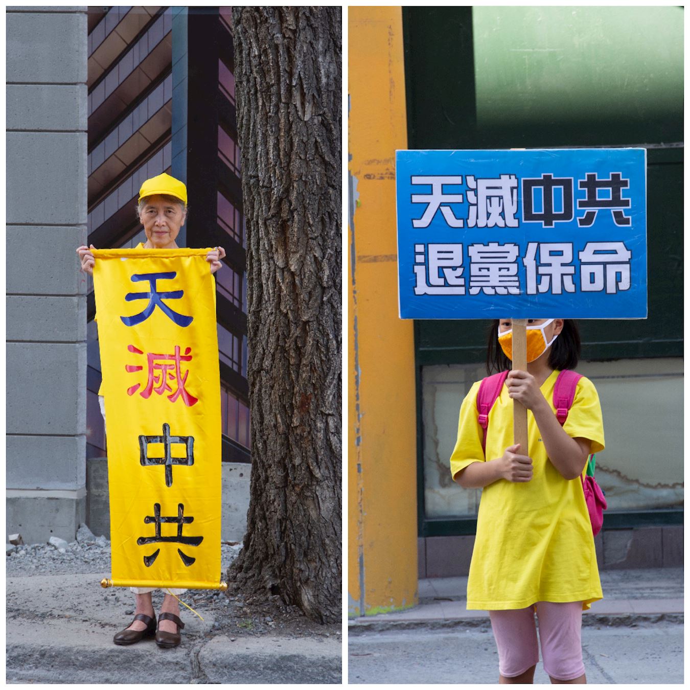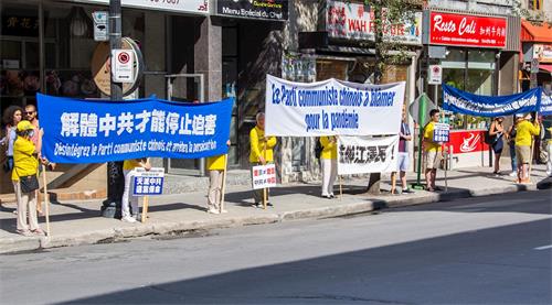 集会后,法轮功学员沿着圣劳伦大街拉起了横幅,“中共是大流行病的祸首”、“中共窃政七十年,害我同胞八千万”、“天灭中共、退党、团、队保平安”等,建起一道真相长城。