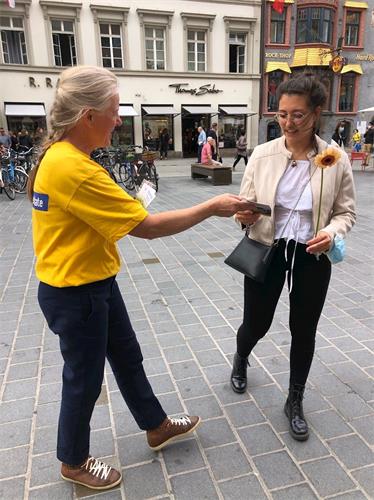 一位来自法国的男士携家人来奥地利旅游。他在征签表上签完名后又折返,因为他想更多了解法轮大法的修炼标准。他很感激能够了解更多相关信息。