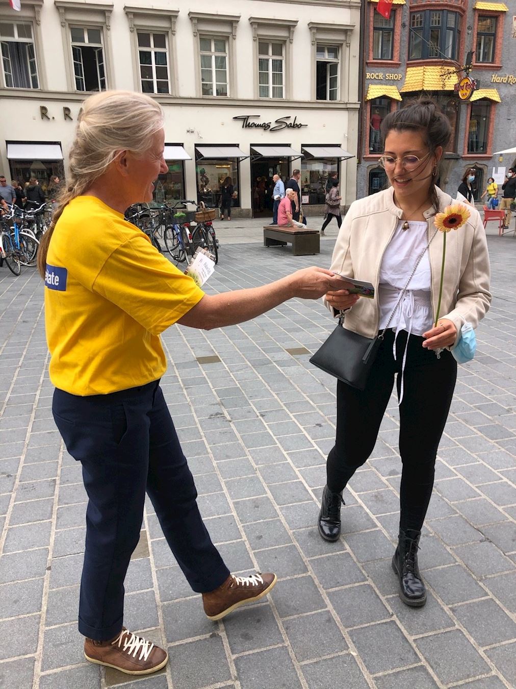 一位来自因斯布鲁克的女士带着两个孩子经过展台。她七岁的儿子对活动非常好奇,很感兴趣地提了很多问题。母亲则在征签表上签了名,表达她的正义心声。