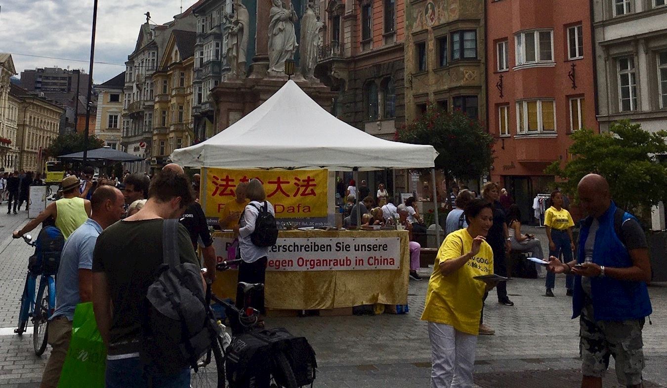 【明慧网二零二零年八月十九日】二零二零年八月十四日,奥地利法轮功学员在因斯布鲁克城区的安娜柱举办信息日活动,揭露中共对法轮功的迫害。很多游客和当地居民前来了解法轮功的信息并签名声援反迫害。