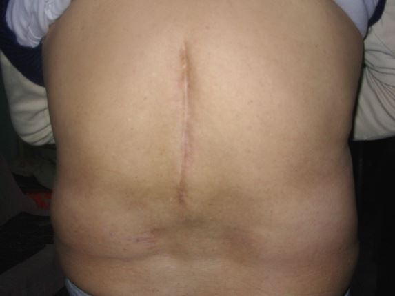 青岩康复后的后背照,脊柱处痊愈的伤痕有十五厘米