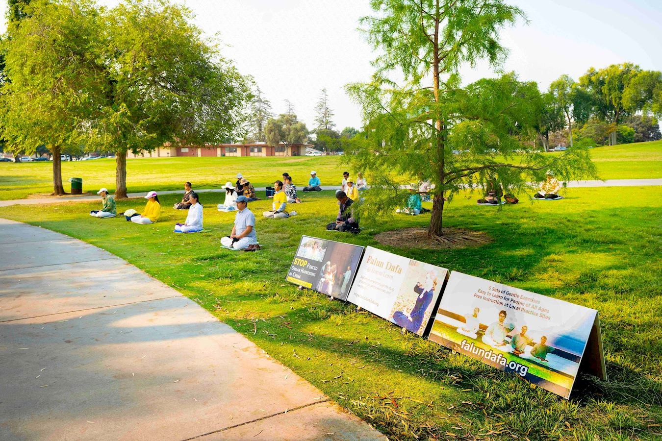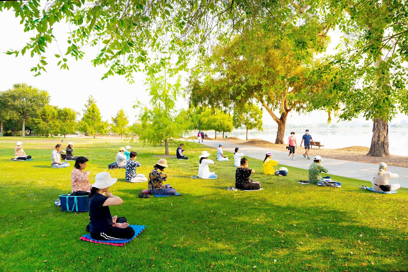 图1~3:法轮功学员在佛利蒙中央公园伊丽莎白湖畔炼功