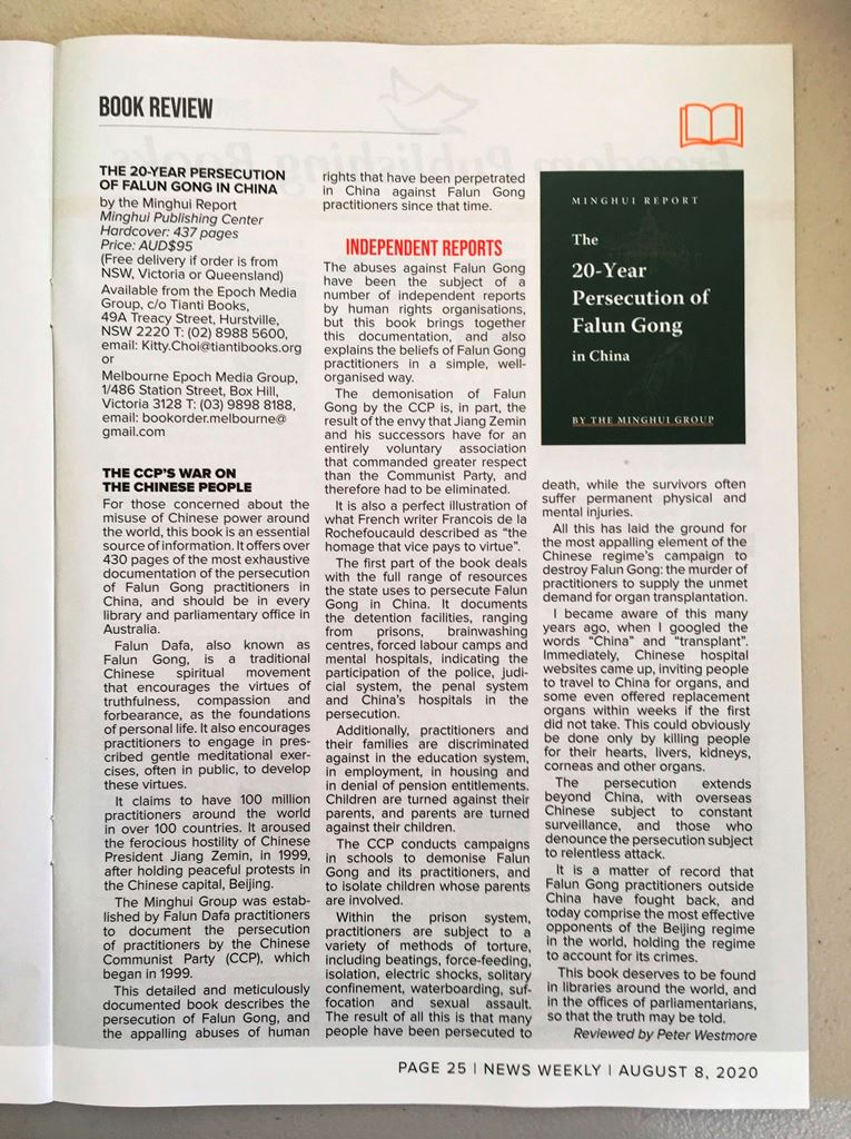 ![]() 图:二零二零年八月八日出版的澳洲《新闻周刊》(News Weekly)杂志,刊登了书评,介绍《明慧报告:法轮功在中国大陆被迫害二十年》一书。 |