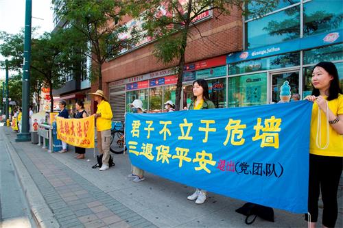 8月22日,在加拿大西部的卡尔加里市中心也举行了退党集会和汽车游行。集会结束后,近20辆汽车顶着“ 天灭中共”、“中共是最邪恶的病毒 祸害全世界”、“中共撒谎 人民死亡”等中英文标牌,从唐人街出发,绕市中心数圈,然后行至东北区老大统华超市,再自东向西,驶到新大统华超市,行程近两个小时。