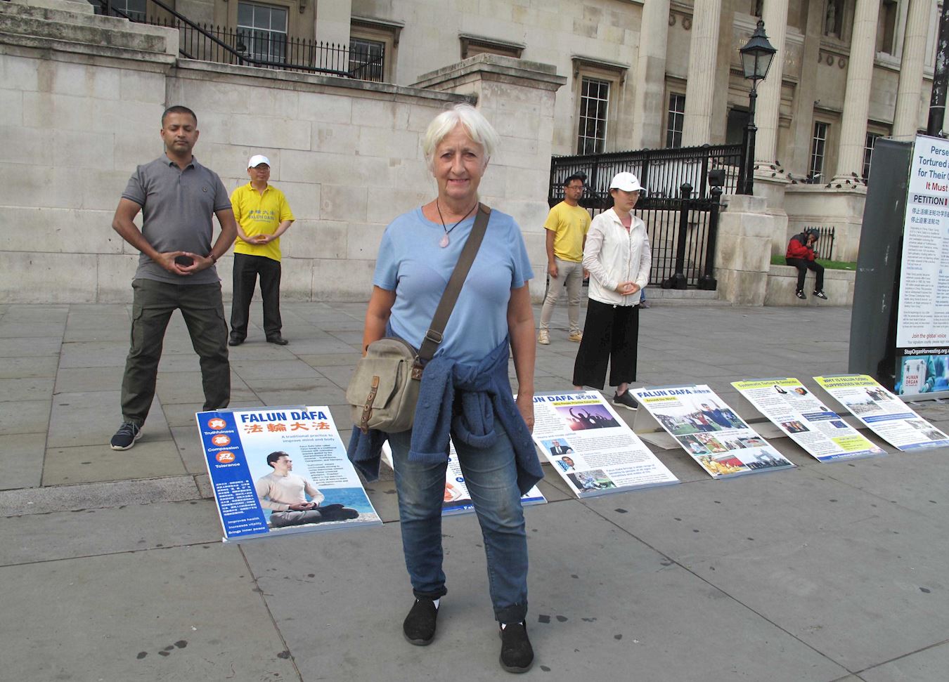 伦敦女士乔(Joe)练过太极,尝试过气功,八月二十二日在特拉法加广场了解真相并现场感受法轮功的平和能量后,立即向法轮功学员询问伦敦当地炼功点,表示要马上去学。