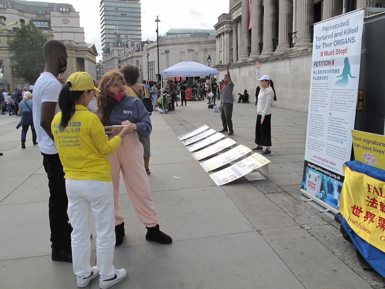 当天六个小时的活动吸引来自四面八方的民众驻足观看,人们纷纷签名支持法轮功反迫害,希望制止中共对法轮功的迫害,制止中共活摘法轮功学员器官的反人类暴行。法轮功学员弗兰克(Frank)在伦敦一家医院工作,他注意到当天有多位医学界人士主动签名支持制止迫害,其中一签名人注明自己是英国国家保健系统(NHS)的医生。