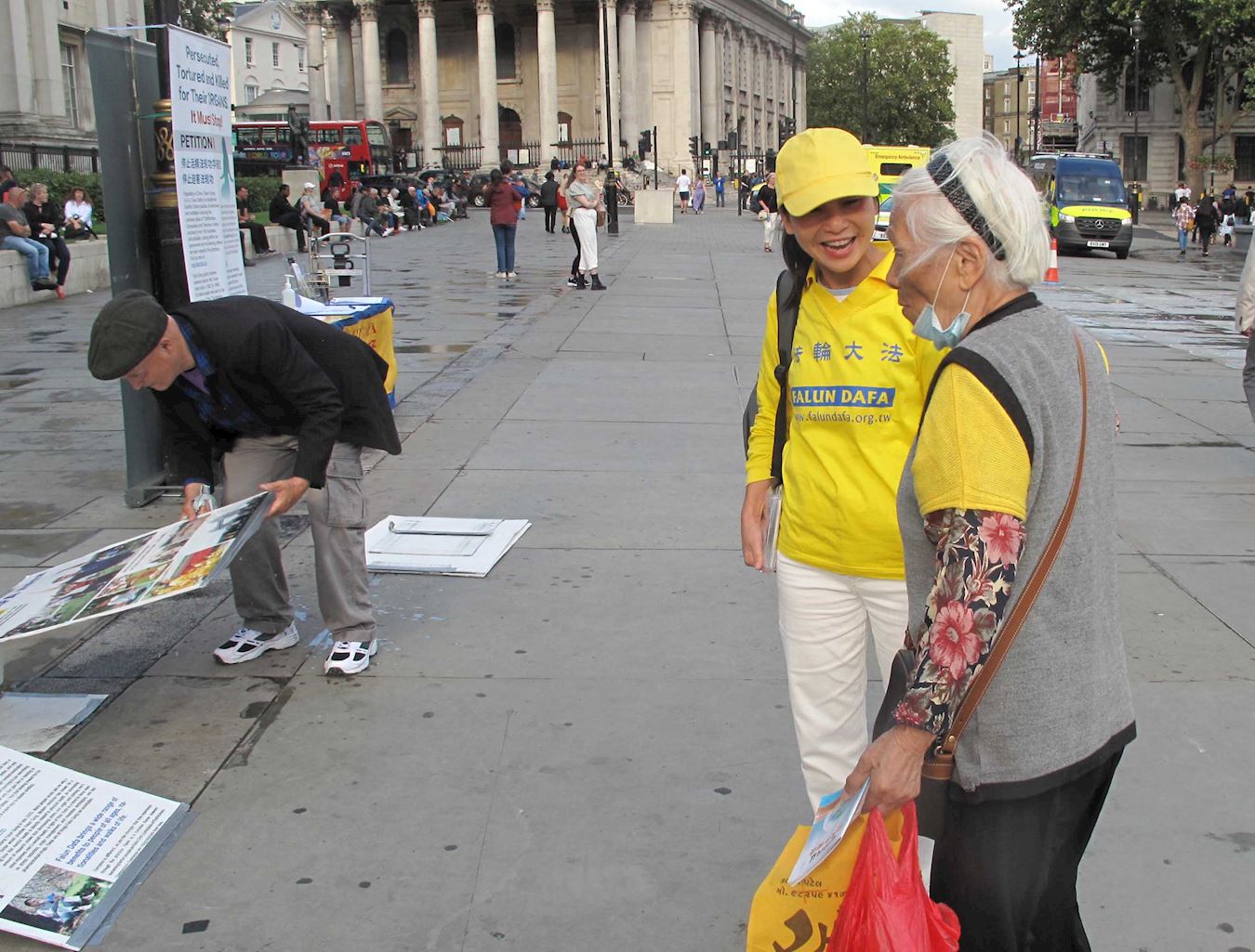 ![]() 图4:二零二零年八月二十二日,英国女士莎莉娜·塞尔温(Sallynae Selwyn)在特拉法加广场主动签名反迫害,她希望法轮功学员到每一个公园里去炼功,带给整个社会平安和平衡。 |