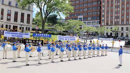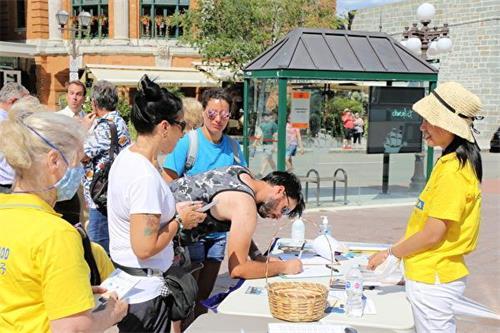 当天阳光和煦,天国乐团的美妙旋律,醒目的中法双语横幅,法轮功学员的发言和优美祥和的功法展示,十分引人注目。许多民众驻足在展板前仔细阅读,了解真相。当他们知道中共对法轮功的残酷迫害,甚至活体摘取法轮功学员器官牟利的罪行时,纷纷主动询问在场的法轮功学员,要求签署请愿书。