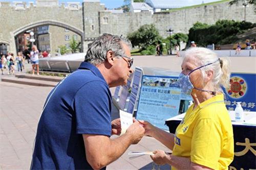 ![]() 图6~7:2020年8月22日,法轮功学员在魁北克省府魁北克市中心的杜维尔(D'Youville)广场传递真相,呼吁结束中共对法轮功长达21年的迫害。现场民众踊跃签署请愿信。 |
