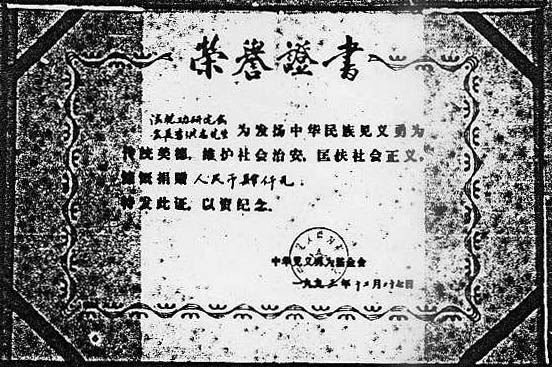【荣誉证书】正文写着:“法轮功研究会会长李洪志先生为发扬中华民族见义勇为传统美德,维护社会治安,匡扶社会正义,慷慨捐赠人民币肆仟元。特发此证,以资纪念。”