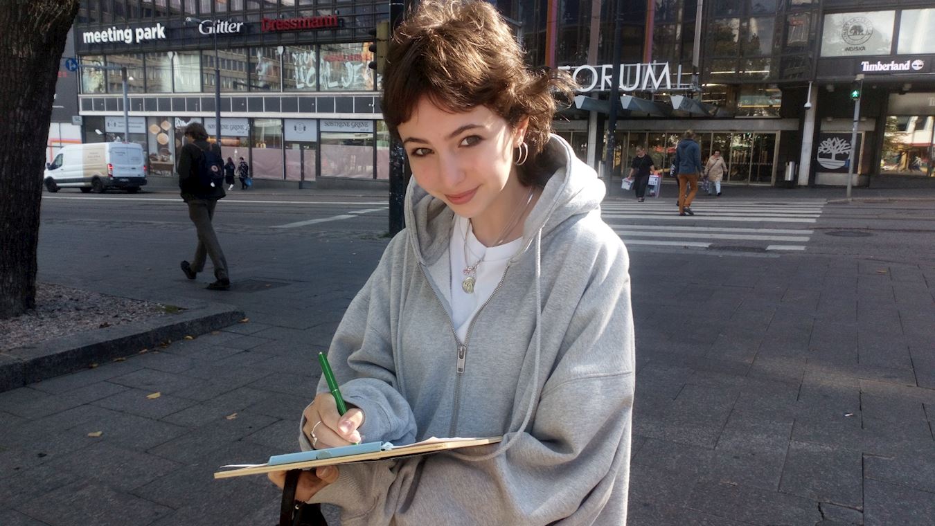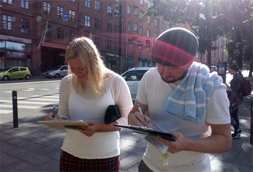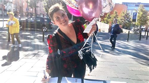 苏菲雅(Sofia)是一位罗马尼亚的学生,在芬兰生活了四年。她站在不远处看着法轮功学员的帐篷上关于中共活摘法轮功学员器官的信息,她说:“一年前,我也看到过你们的活动。我还要签名支持你们。”