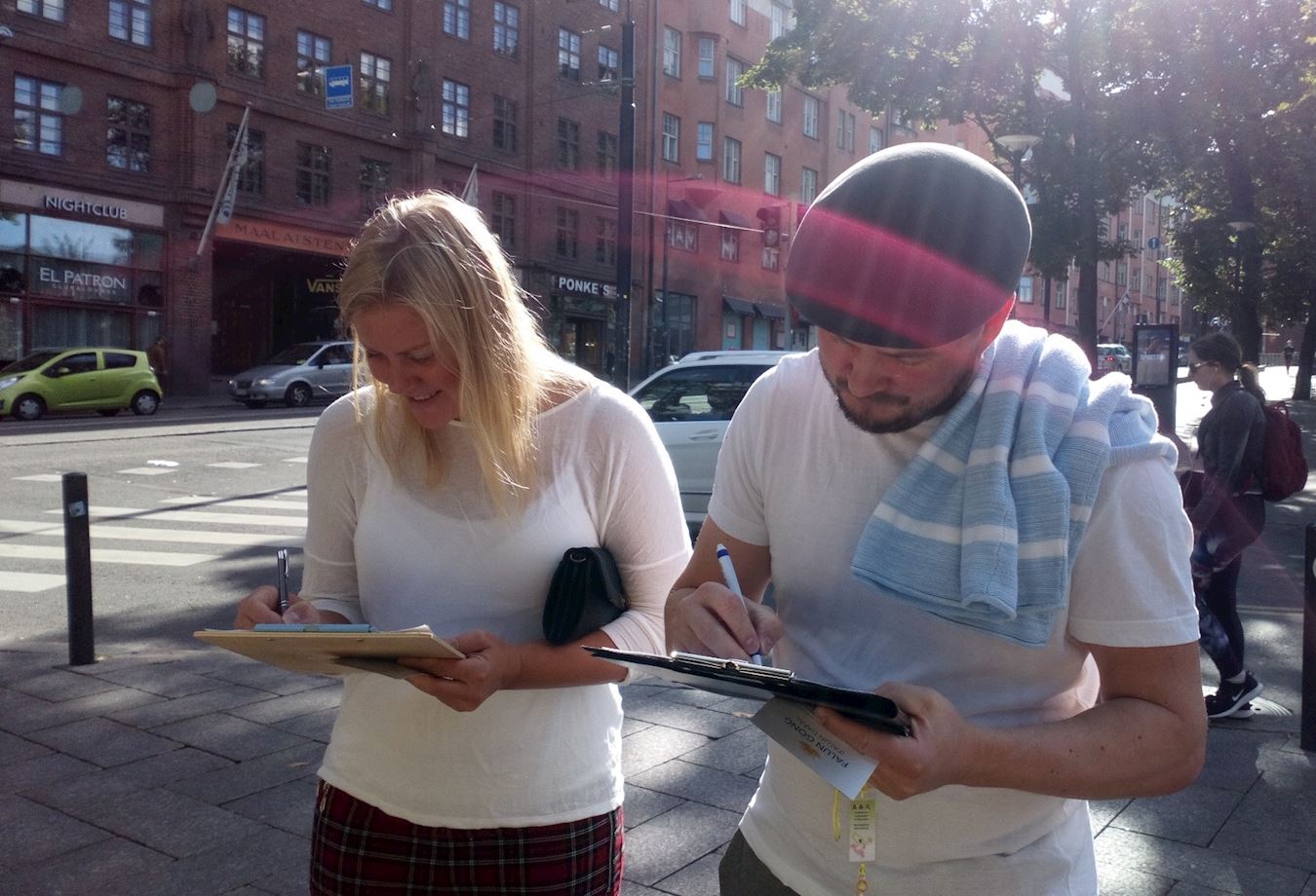穿着白衣服高个子欧尼(Ooni)看见帐篷上写的“法轮功”,马上说要签名,然后就娓娓道来自己了解法轮功的经过:他有一位朋友是伊朗人,在芬兰居住,也学炼法轮功,并把法轮功真相信息放在自己的社交媒体上。他从朋友那里了解到很多关于法轮功被迫害的信息。他旁边站着亚格(Jaakko)没有听过法轮功受中共残酷迫害的真相,欧尼就很仔细地把他了解的情况告诉亚格,亚格听后非常震惊,表示要签名支持。