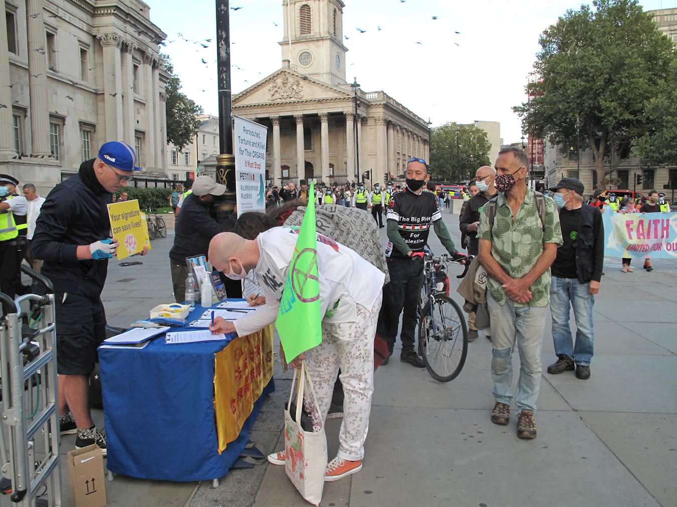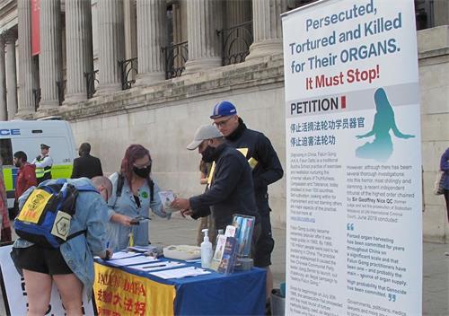 ![]() 图1~2:二零二零年九月五日,法轮功学员在伦敦特拉法加广场(Trafalgar Square, 又称鸽子广场)摆放真相展板、炼功、发放真相传单,吸引过往民众驻足了解真相,人们纷纷在请愿书上签名支持法轮功反迫害。 |