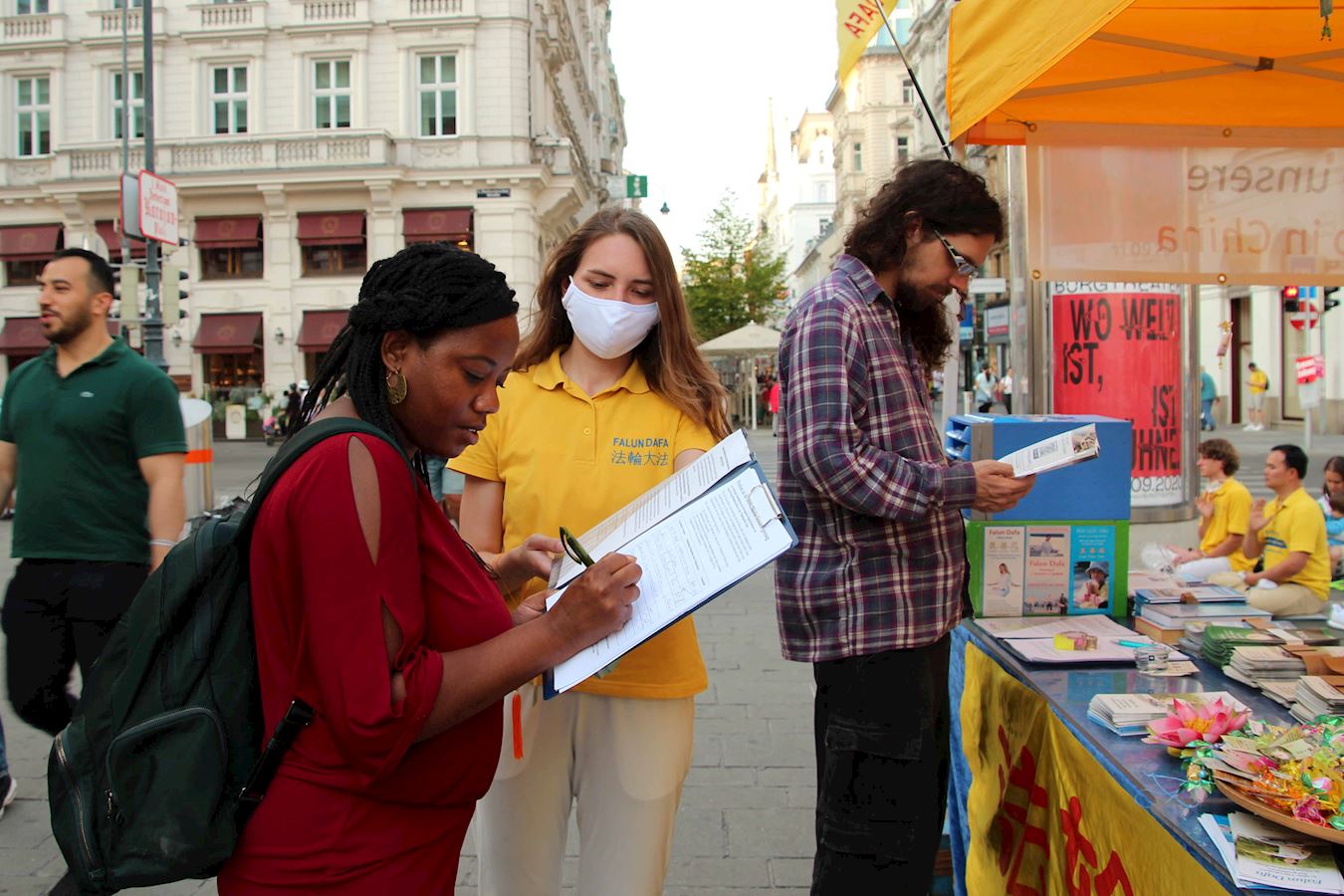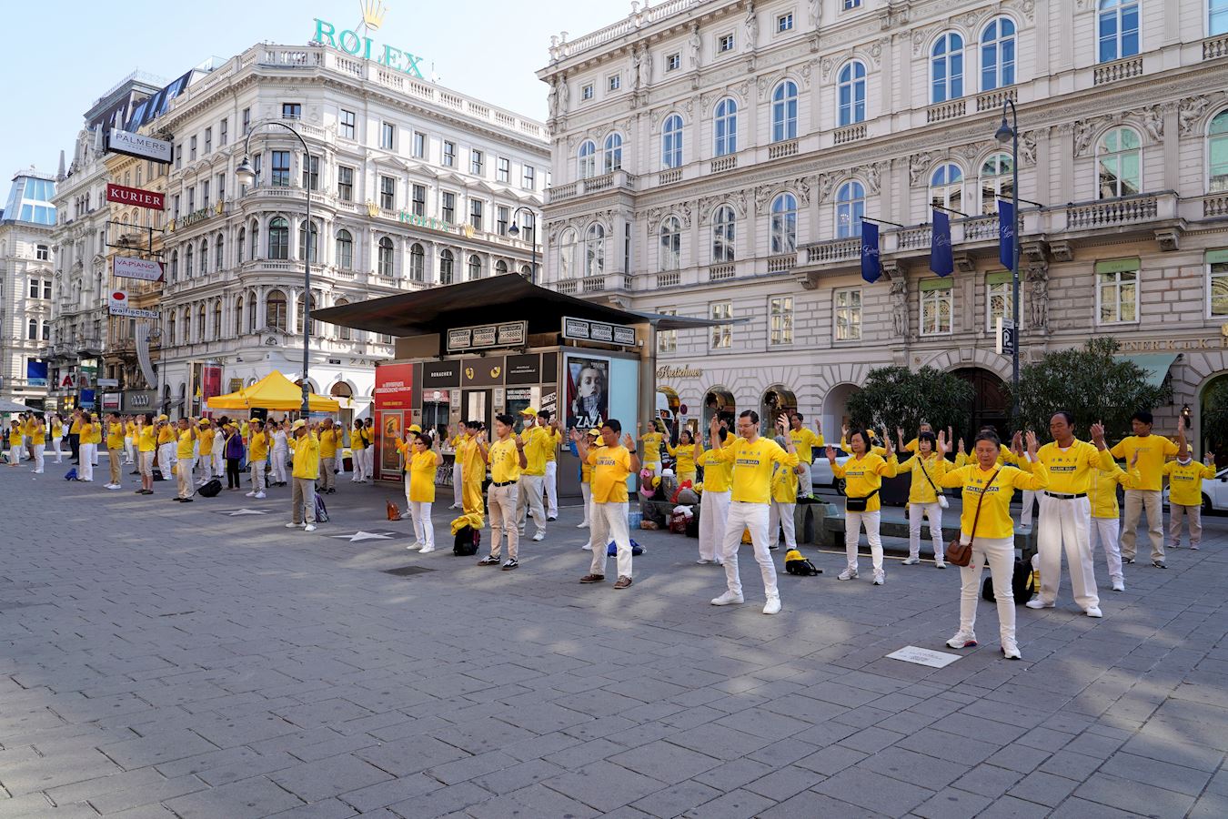 【明慧网二零二零年九月十六日】(明慧网欧洲记者站报道)二零二零年九月十二日,来自欧洲多个国家法轮功学员聚集在奥地利首都维也纳国家歌剧院旁边的广场上(Herbert von Karajan Platz),优美的功法展示,天国乐团震撼人心的乐曲,亮眼的腰鼓队的演奏以及法轮功学员的演讲让很多路人第一次领略到法轮大法的美好。很多人在制止中共活摘器官及结束中共迫害法轮功的征签表上签名。