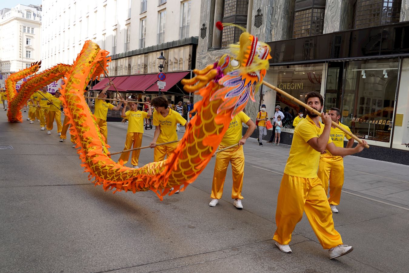 下午,由警察开道,天国乐团打头阵,法轮功学员开始了在维也纳市中心的游行,继续传递法轮功的真相。这是当地自疫情爆发后第一次批准的游行。