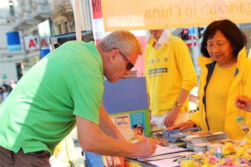 地理学专业的学生安德烈(Andre)是看到法轮功学员的功法演示后,开始注意到征签的。签名后他谈到:“我支持他们(法轮功学员),在当今的社会不应该有活摘器官的存在,应该被禁止,是时候制止它了。”他打算告诉他的朋友们一起签名支持法轮功学员。