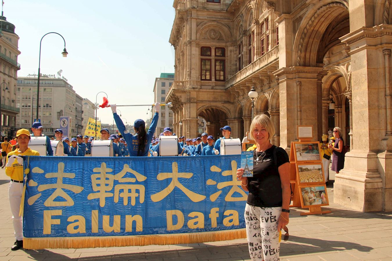 曾经在美国德州居住,现居维也纳的迈尔夫妇前些日子在法轮功学员的信息日活动上了解到法轮功,并且知道此次的游行活动,因此特地前来观看。当看到真人模拟演示活摘和酷刑迫害的场景,迈尔太太(Helga Mayr)对先生惊呼:“看,这是多么残忍恶心啊!”迈尔先生(Willi Mayr)回应道:“哦,我们可得对此做点什么(制止这迫害)!”
