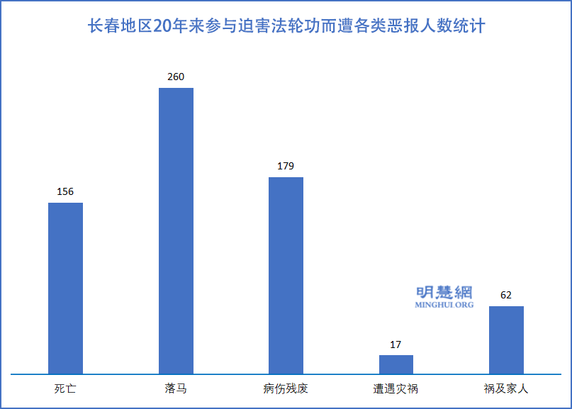 根据明慧网的报道统计,二十年来长春地区参与迫害法轮功而遭到恶报者至少有674人,其中,死亡人数为156,遭恶报落马为260人,病伤残废为179人,灾祸17人,祸及家人的案例为62人次。绝大多数的恶报发生在公、检、法系统与迫害法轮功的相关部门的人员中。