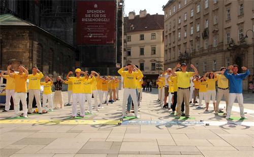 二零二零年九月十三日,在史蒂芬广场又架起了金黄色的帐篷,摆出了介绍法轮功广传世界及常年反迫害的小型图片展,摊开了呼吁奥地利政府帮助制止中共活摘器官及迫害法轮功的征签表。身着黄色体恤的法轮功学员,向路人分发真相资料,介绍法轮大法的美好,也揭露中共对法轮功的血腥迫害。当天还有欧洲天国乐团的表演,给路人送上了听觉上的飨宴。
