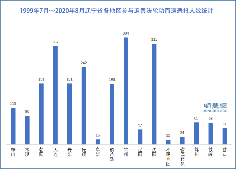 ![]() 图3:1999年7月~2020年8月辽宁省各地区参与迫害法轮功而遭恶报人数统计 |