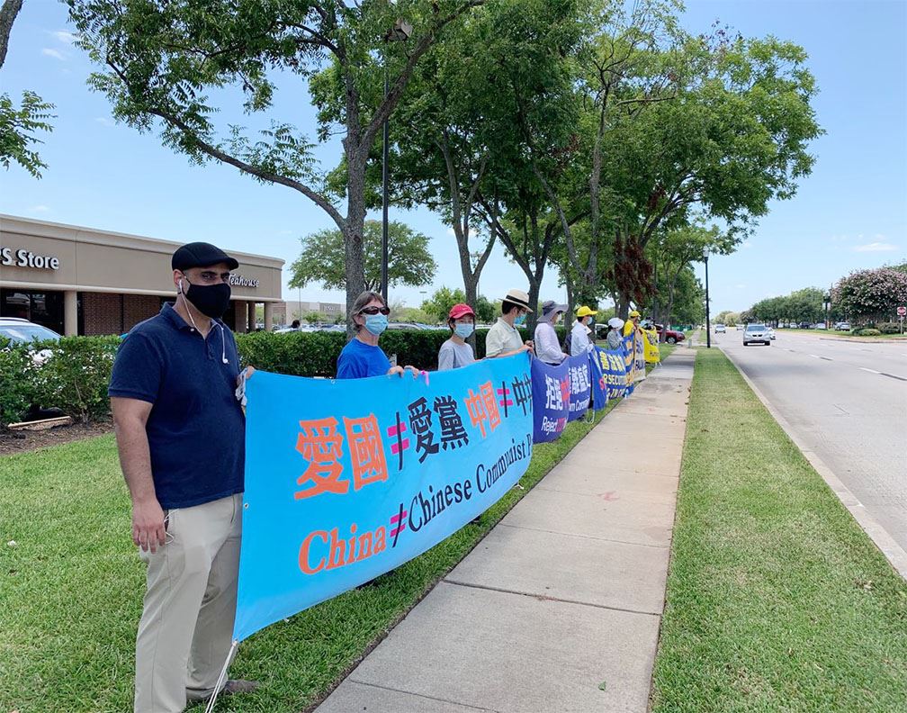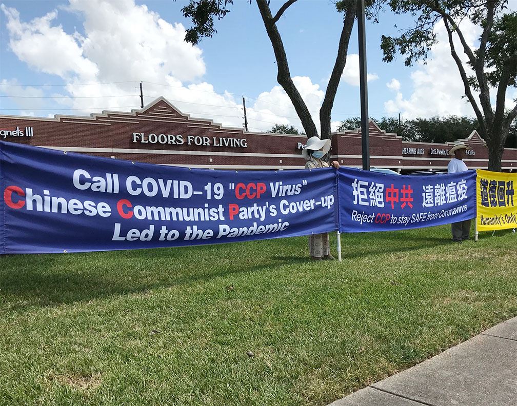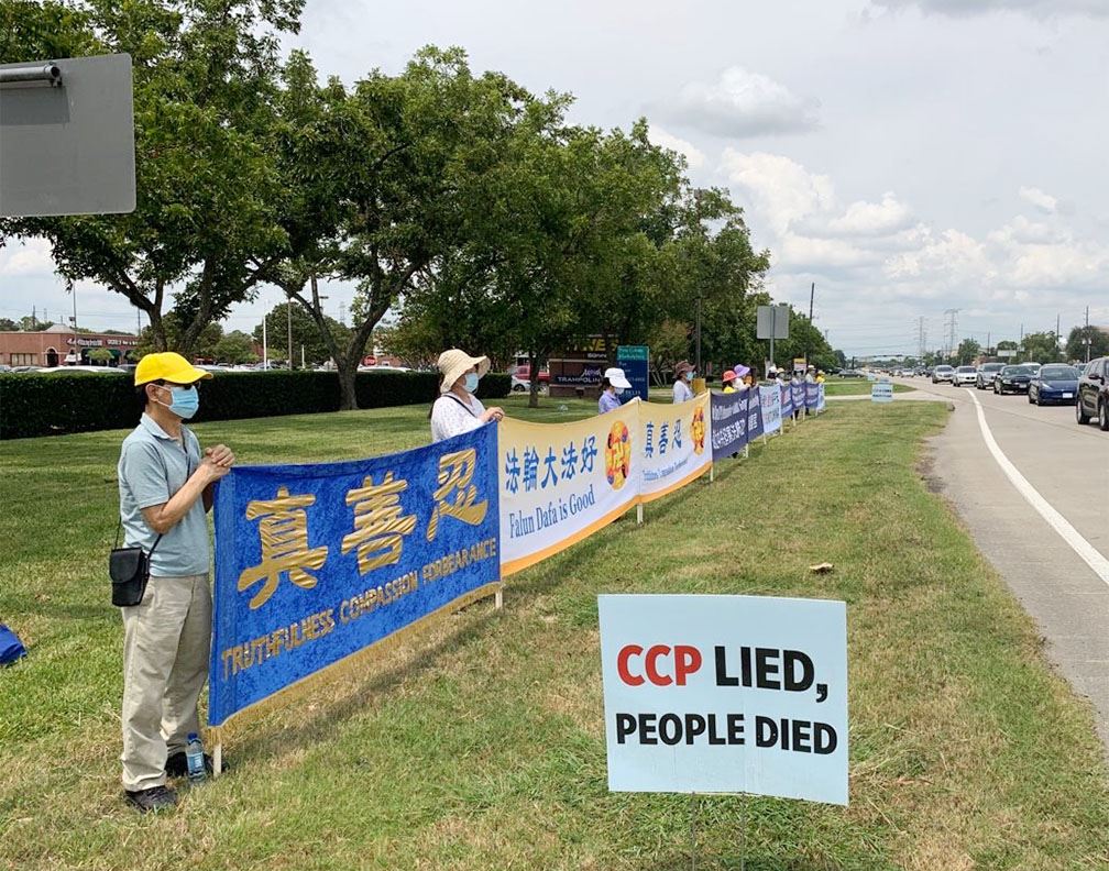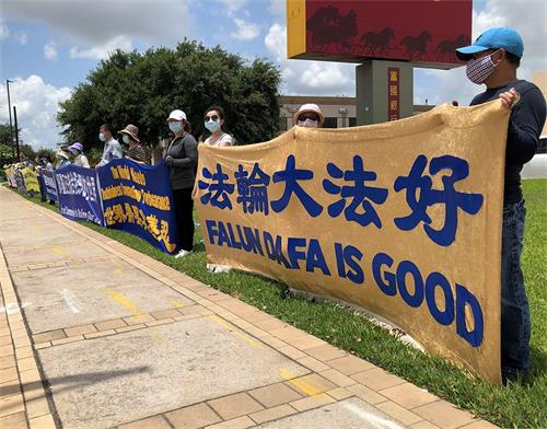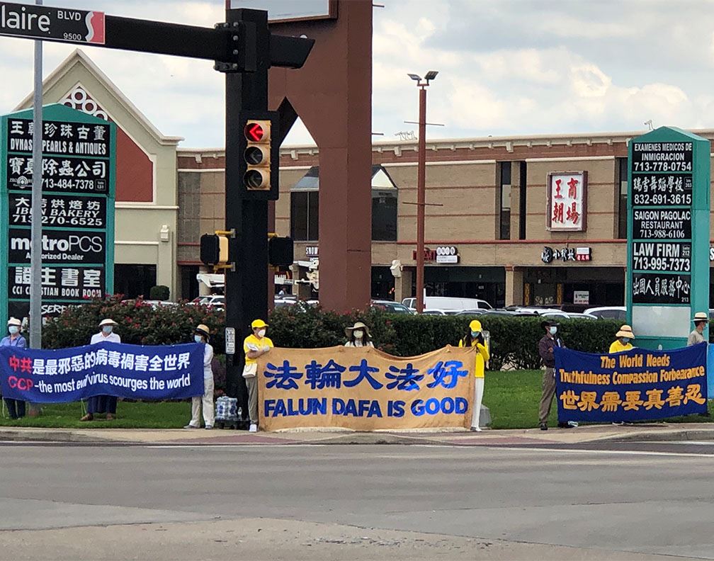 学员选择的活动场地是中国城和糖城。中国城属于哈里斯郡(Harris City),位于休士顿市中心,建筑更新,商家比比皆是,穿越中国城的百利大道(Bellaire Blvd)两端连接59号与8号高速公路。在疫情期间,周末仍然有来来往往的车辆通行百利大道,星期六中午学员在百利大道旁展示横幅的活动成了民众的关注点。糖城(Sugar Land City)是大休士顿地区的第三大卫星城,二零二零年评估糖城是大休士顿地区最佳城市(糖城官方网)。休士顿所属美国南部,八月份有时中午气温高达华氏106度。能够在高温下又有平静的场景,引人注目,有些驾驶员竖大拇指,有些驾驶员按汽车喇叭以示支持。有一位男士开车路过学员的横幅前对学员说:“你们真棒。”一位中年华人男士,一边拍照横幅一边说:“你们规模很大,真了不起。”
