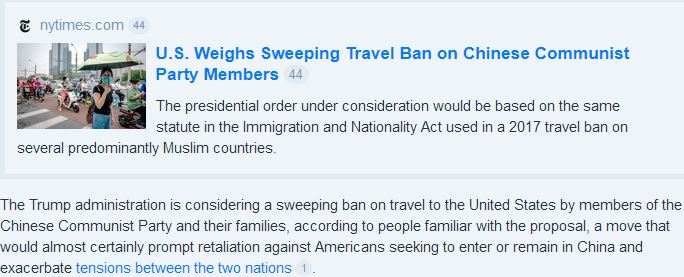 ![]() 图1:《纽时》报道美国政府考虑取消中共党员及其家属入境签证 |