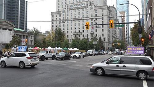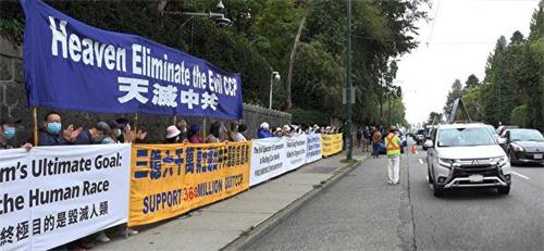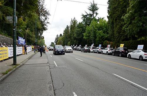 过往车辆不断鸣笛声援,过路的司机和乘客或竖起大拇指,或打出V字手势,或挥拳助阵,更有司机特意把车停妥后,下车录影拍照。集会后由数十辆汽车组成的3列车队在众人的掌声中,缓缓列队从中领馆前绕行后,分别奔赴温哥华、本拿比、列治文等城市巡回展示车顶真相展板,路人纷纷鸣笛声援,场面热烈。