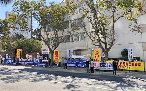 当天上午十一点左右,旧金山湾区的法轮功学员们陆续来到旧金山中领馆前,打出“停止迫害法轮功”,“制止活摘法轮功学员器官”,“法轮大法好”,“世界需要真善忍”,“解体中共 停止迫害”,“法办江泽民”,“天灭中共 三退保平安”等横幅。