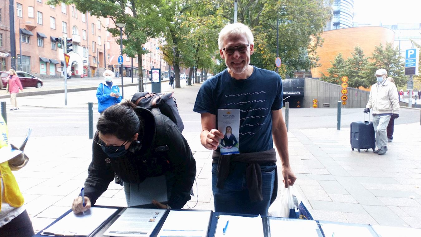 【明慧网二零二零年九月二十九日】二零二零年九月二十六日星期六,芬兰法轮功学员一如既往的来到赫尔辛基甘比(Kampi)商业中心附近的广场上,举办讲真相活动。很多民众说:“你们做的是很重要的事情!”“你们要加油!”“我能为你们做什么?”等等,以此来表达对法轮功学员和平理性反迫害的支持。