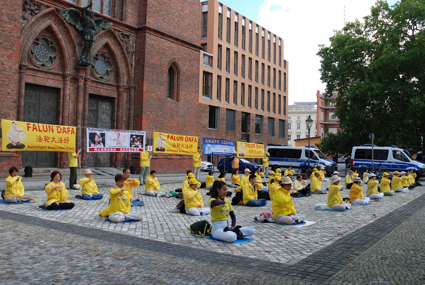 ![]() 图1:德国外交部门外法轮功学员炼功,抗议中共的迫害。 |