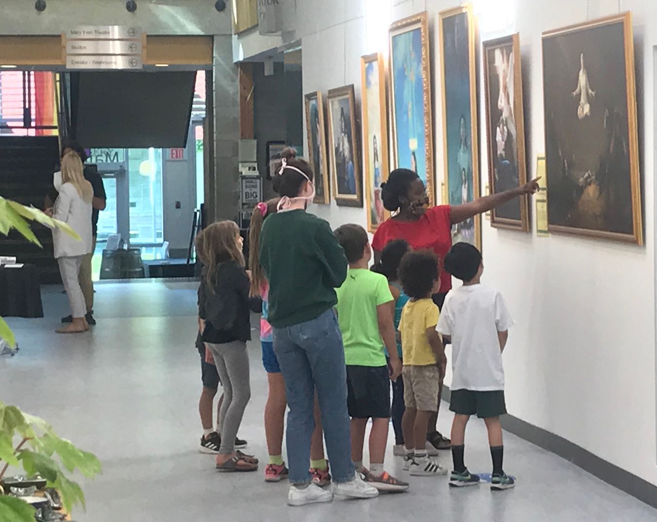 一位艺术教师带领学生仔仔细细观摩了每一幅画作,认真阅读了所有的说明。作品中散发出来的平静祥和的美,让小朋友们感到美好神圣。