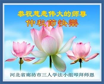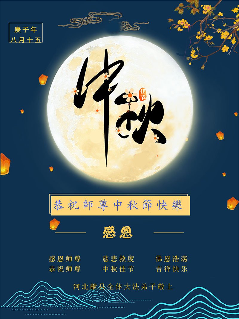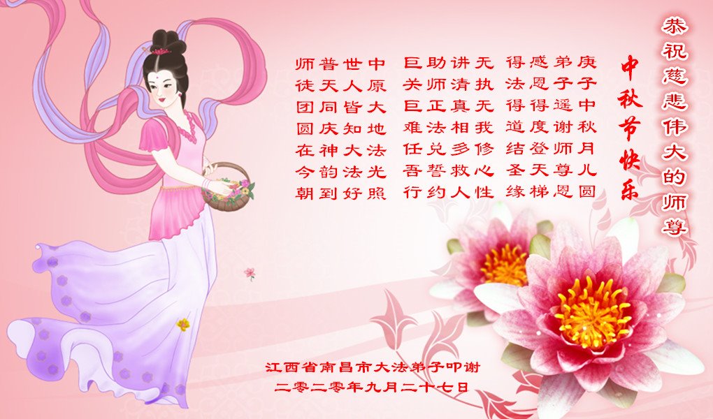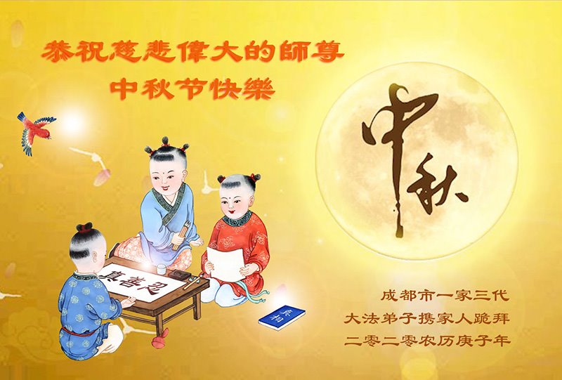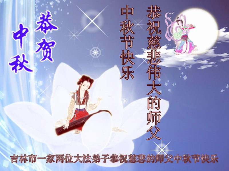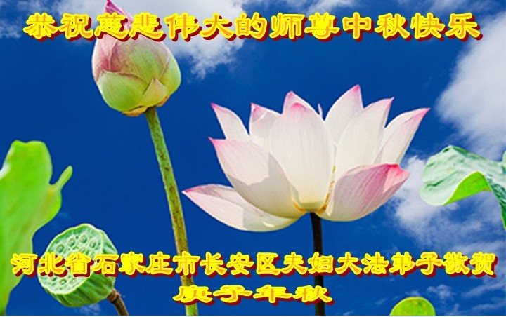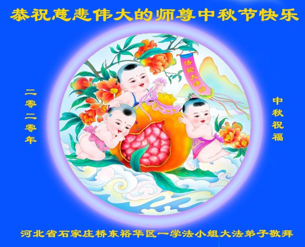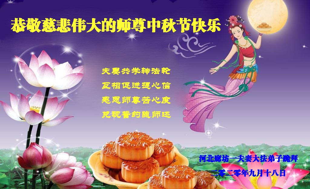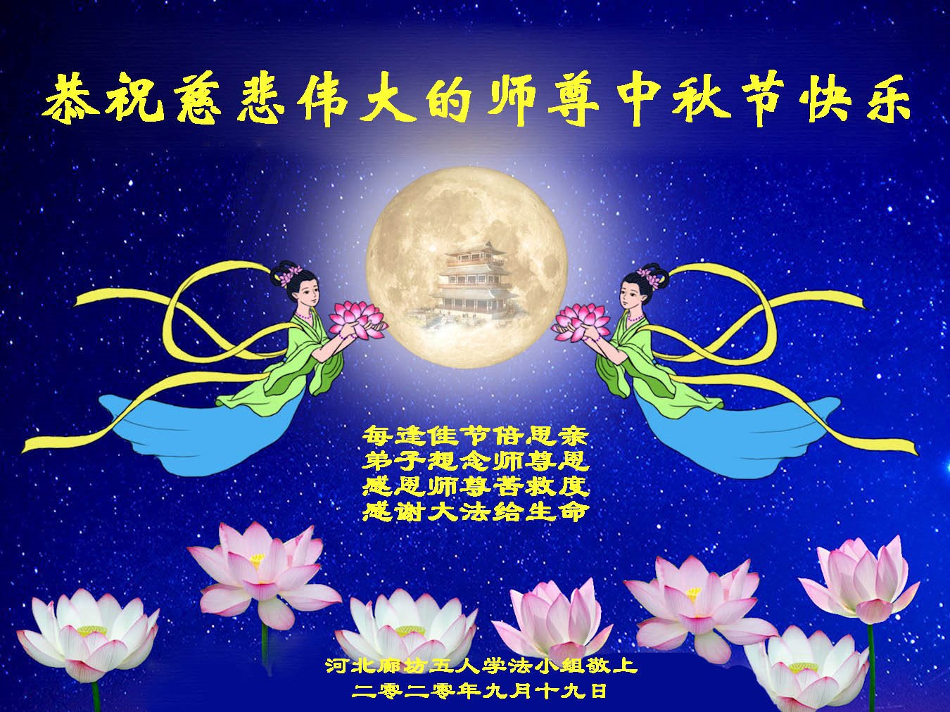 在2020年中秋节即将到来之际,我们夫妻大法弟子恭祝师尊中秋节快乐!我们是北京的一对教师大法弟子。1999年邪党迫害大法之后,我们坚定修炼,都失去了正式工作,但在师父的保护下,我们创办了文化公司,到农村、大学、小学、幼儿园等弘扬传统文化,10年间使几十所学校的师生受益。我们也有了稳定的工作,2020年还住進了翻盖的新房,得到了邻居的赞扬,这都是意想不到的事情,这是恩师的赐予,我们夫妻感谢师父慈悲苦度!