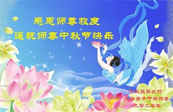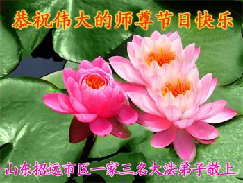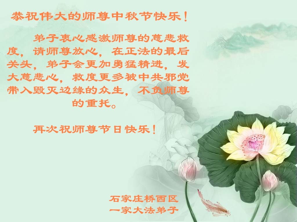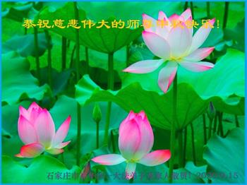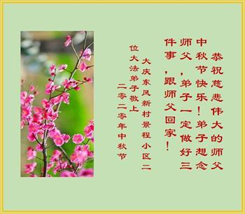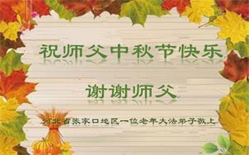河北省石家庄市炼油厂大法弟子说:“在这阖家团圆的日子,弟子非常想念伟大的师尊!感恩师尊二十多年的一路保护,使弟子能在这场邪恶的迫害中走到了今天,不知师尊为弟子和众生承受了多少苦难,弟子只有无尽的感恩!”
