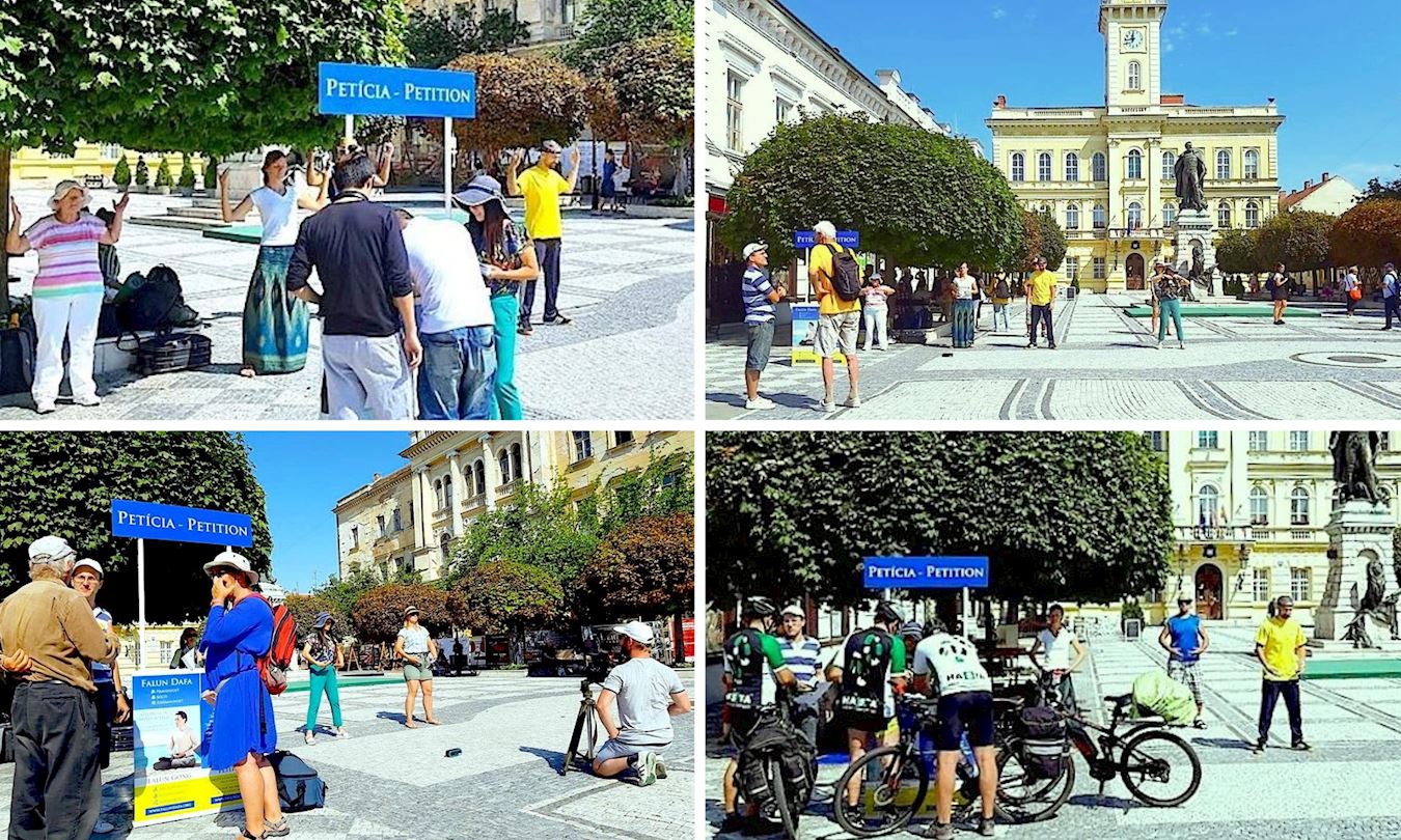 一对来自德国的老年夫妇被学员们的炼功场景所吸引,驻足观看并与学员交谈了起来。当了解到善良的法轮功学员因为坚持信仰,坚持“真善忍”的修炼原则而遭到中共的无端抓捕、残酷迫害乃至虐杀,甚至被强行活摘器官的真相后,他们非常震惊。他俩都为能够签名反迫害而感到高兴。与他们同行的还有一位年轻的摄影师,他拍摄了这对老夫妻倾听真相和签名的全过程以及学员们的功法演示。摄影师告诉学员,他俩从多瑙河的发源头开始旅行一直到黑海,他们正在拍摄关于旅行的纪录片, 所以这个反迫害的正义活动会在这个纪录片中出现。