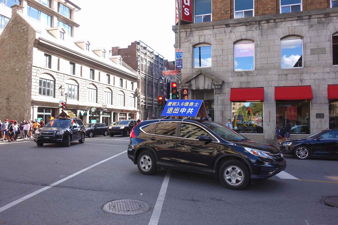 '图1~3:2020年9月5日,蒙特利尔退党服务中心在市中心举行汽车游行,把真相福音广传。'