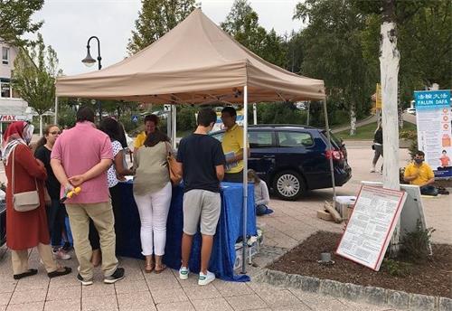 一对生活在欧洲的来自大陆的青年男女坐在信息台不远处的长椅上休息,学员和他们聊了起来。一开始他们说,对中共镇压法轮功没有态度。认为中共之所以镇压,是因为法轮功和外国势力勾结。学员告诉他们不要听信了中共的宣传。接着学员讲述了,法轮功是一种佛家修炼的方法,学员们都是按照真善忍的原则做好人,根本和什么外国势力扯不上关系,中共把一切反抗它的团体都污蔑为所谓勾结境外势力。中共镇压完全是江泽民处于妒嫉,担心太多人学炼法轮功,而没有人听信共产党。学员从中共前人大委员长乔石经过调查做出“法轮功于国于民有百利而无一害”的结论,讲到科痞何祚庥写文章污蔑法轮功,从一九九九年四月二十五日,万名法轮功学员和平上访,再讲到中共发动残酷镇压。