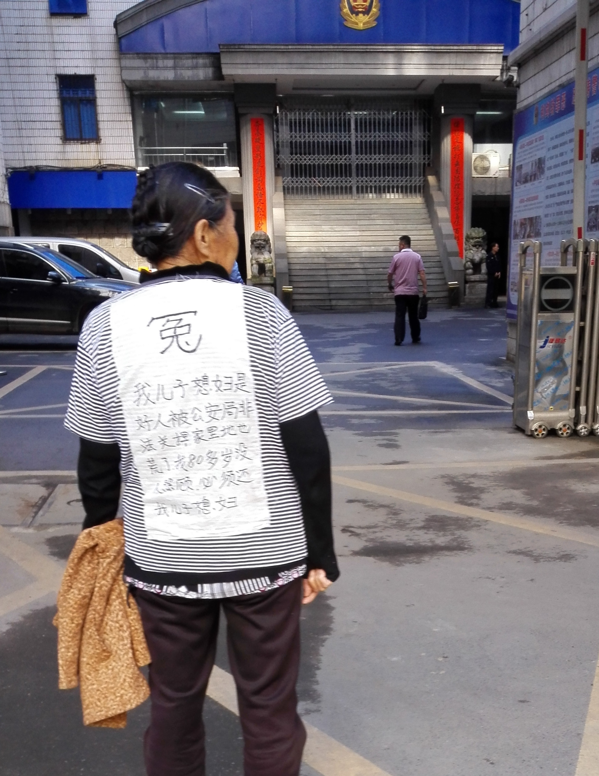 ![]() 谭美丽的八旬婆婆二零一六年五月十六日在公安局门口喊冤,要求释放儿子与媳妇谭美丽。 |