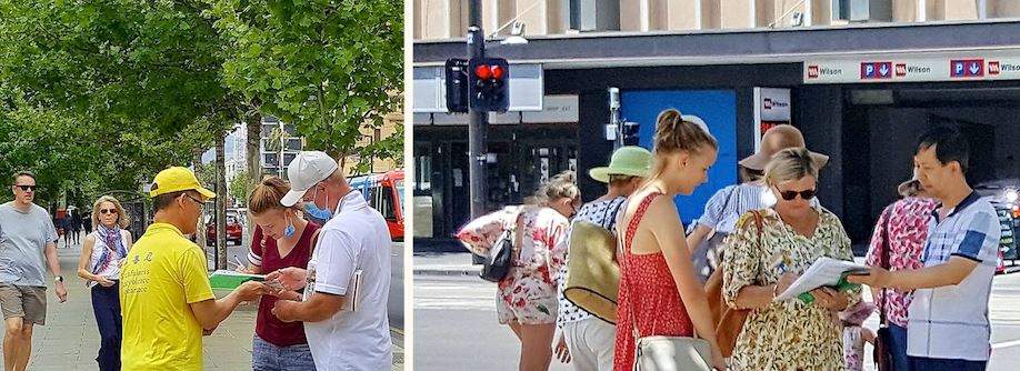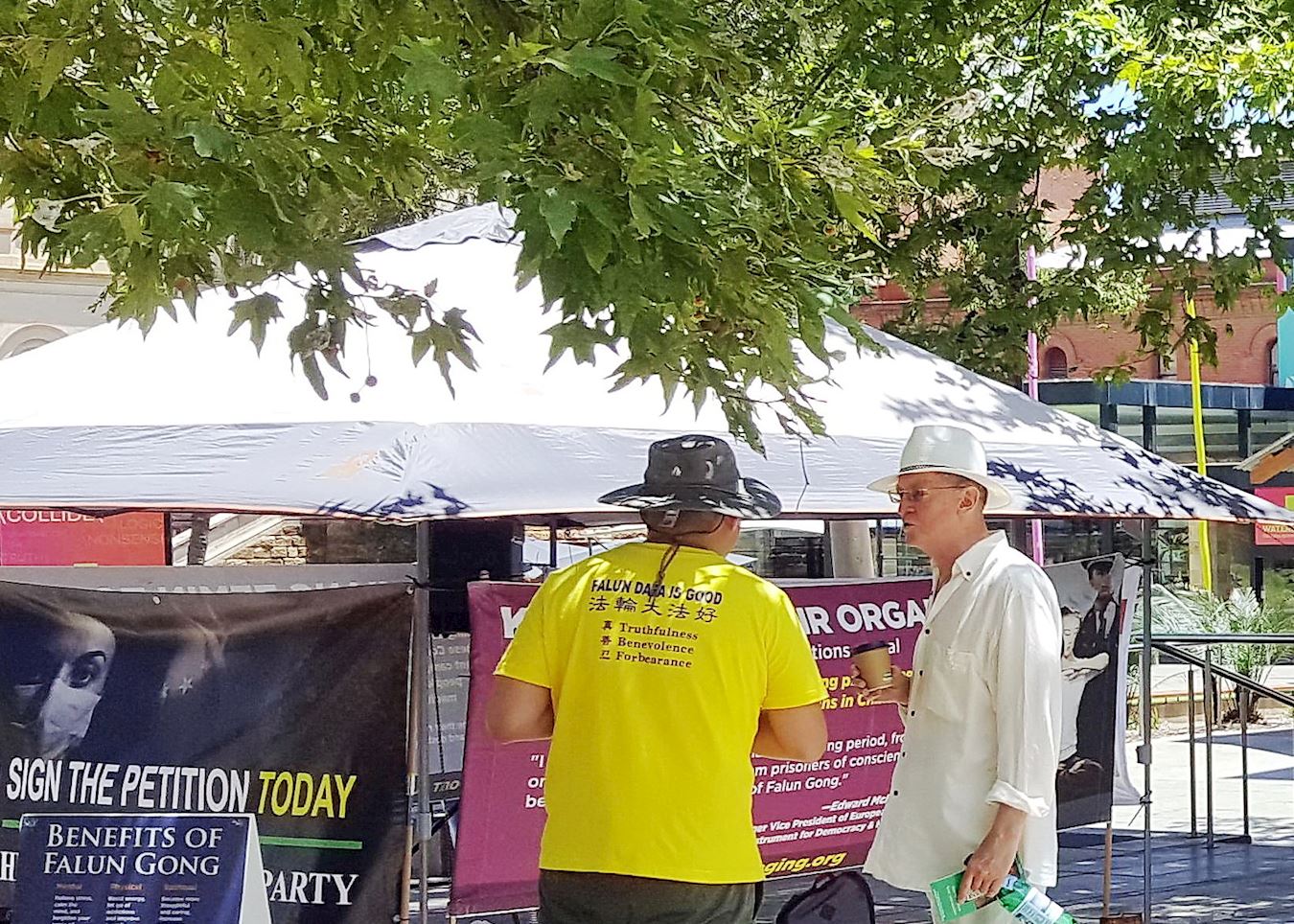 西人菲尔(Phil)和苏菲(Sophie)在听到法轮功学员讲真相后,签名支持并拿取真相传单。菲尔希望世界上的人都能友善相处。他表示教育和健康对人很重要,如果世人都能按照法轮功倡导的真、善、忍原则来做,这些就能得到保障。同时,他为澳洲的多元文化感到自豪,在这里人们能够自由发声。