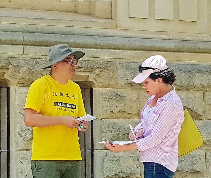 苏菲还表示,善也体现在关心正在发生的事,每个经过这里的人都应该关注(中共迫害法轮功),不能因为事情不是发生在澳洲,或不是发生在自己身上就不关心。她说:“你们做的事很重要,让更多人了解真相是最重要的事。”苏菲正在学中文,今天学到了“真、善、忍”,了解到法轮功是中国传统的修炼文化,她很高兴。