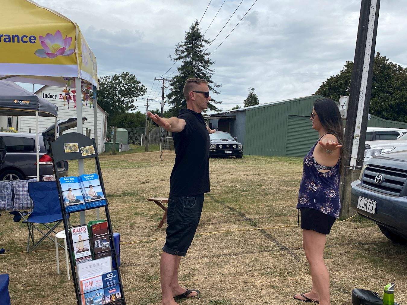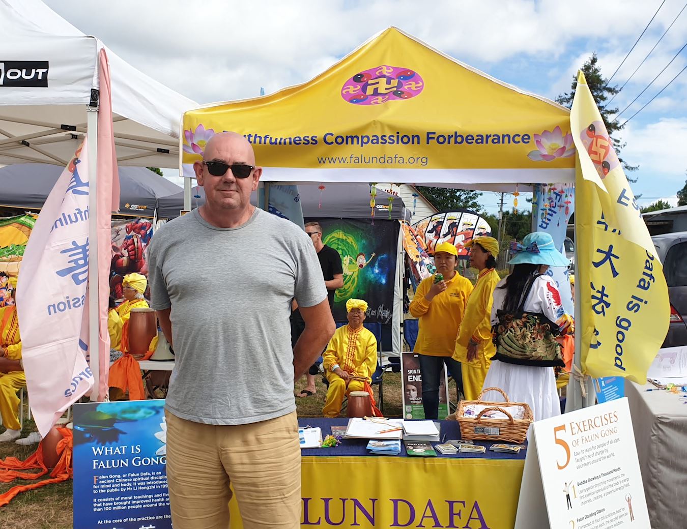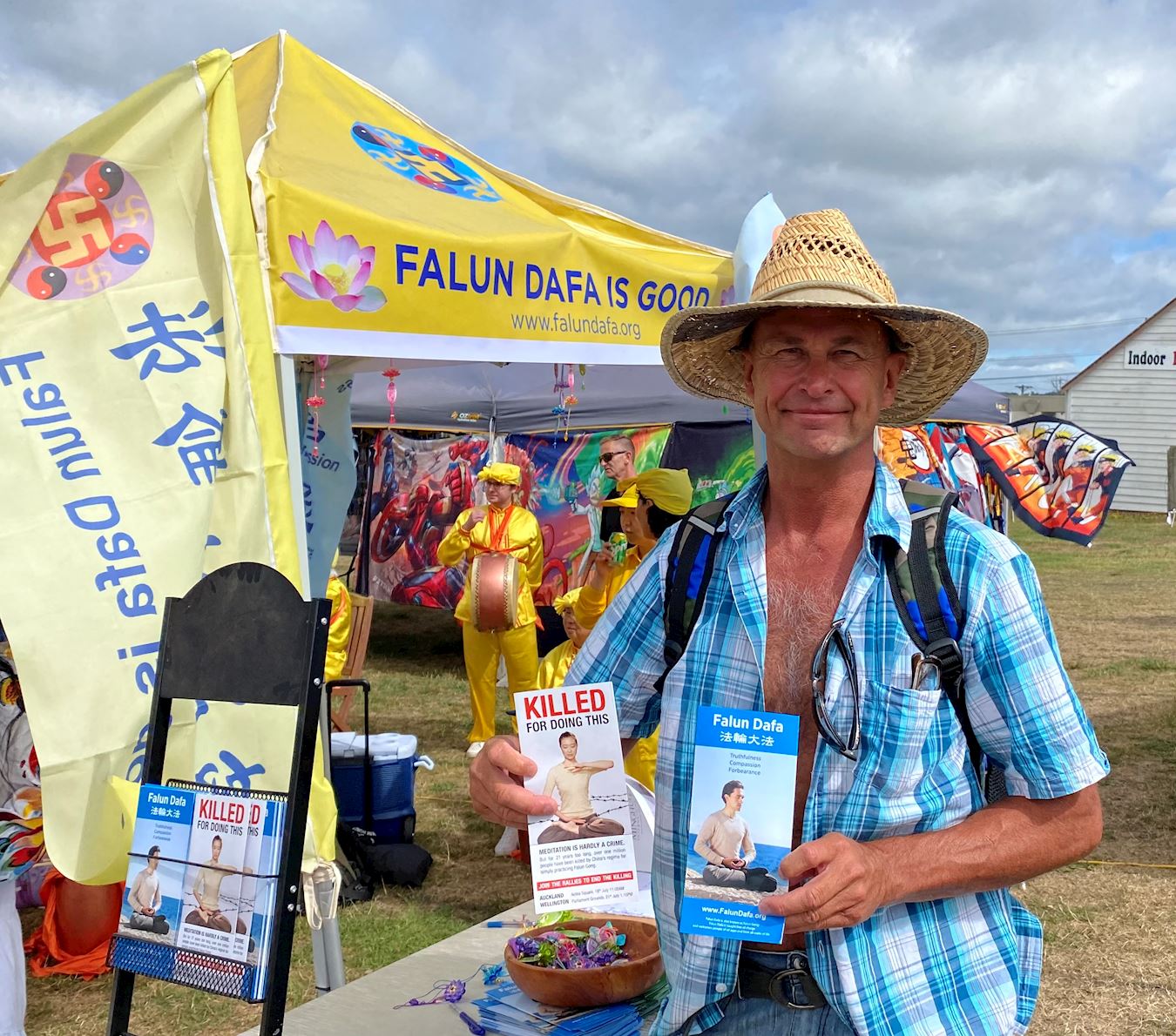 金·皮考克(Kim Peacock)主动来到法轮功书籍的摊位。他介绍说,自己对法轮功的了解是多年前无意中看到一个横幅开始的,尽管上面的很多中文字他看不懂,但他记住了法轮功的英文字。后来他在网上做了很多调查后,得知法轮功是什么,以及中共如何残酷迫害法轮功修炼者和活摘器官的罪恶。